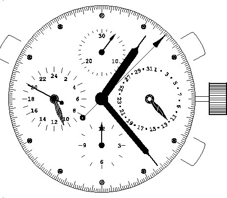 Chronograph Valjoux 7750 with a second timezone at 9 o'clock and date by hand at 3 o'clock. The correction of the second time is made sequentially by a pusher.