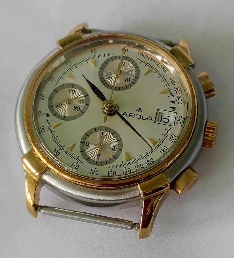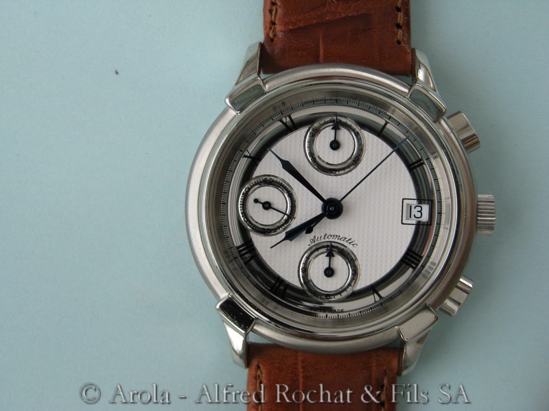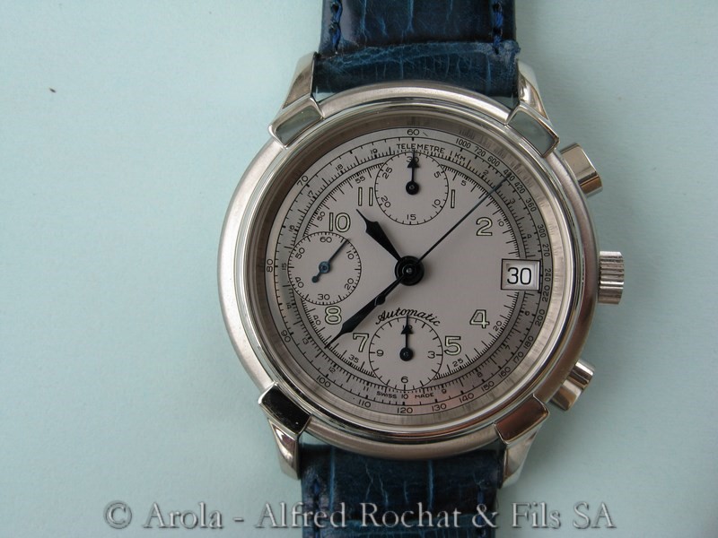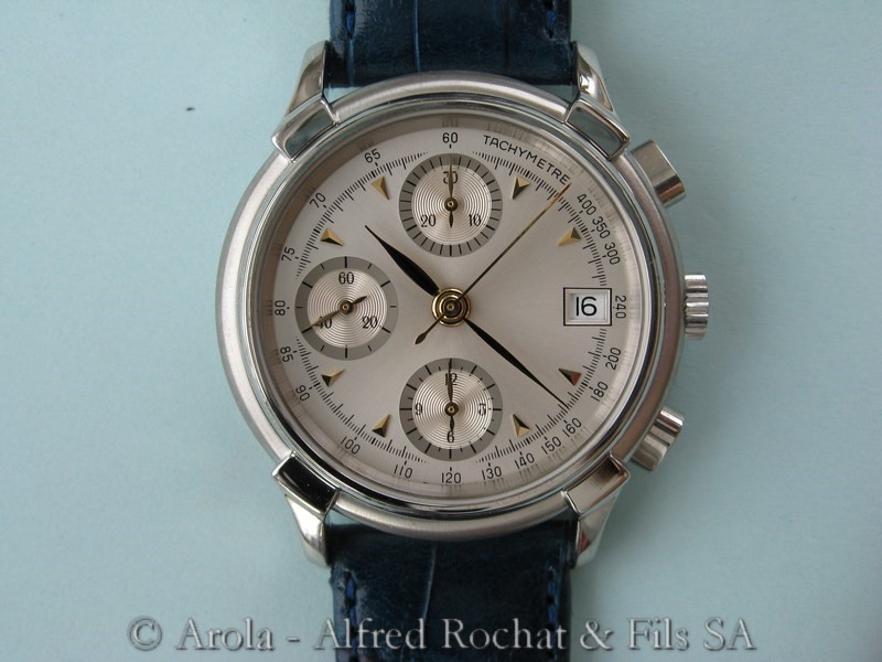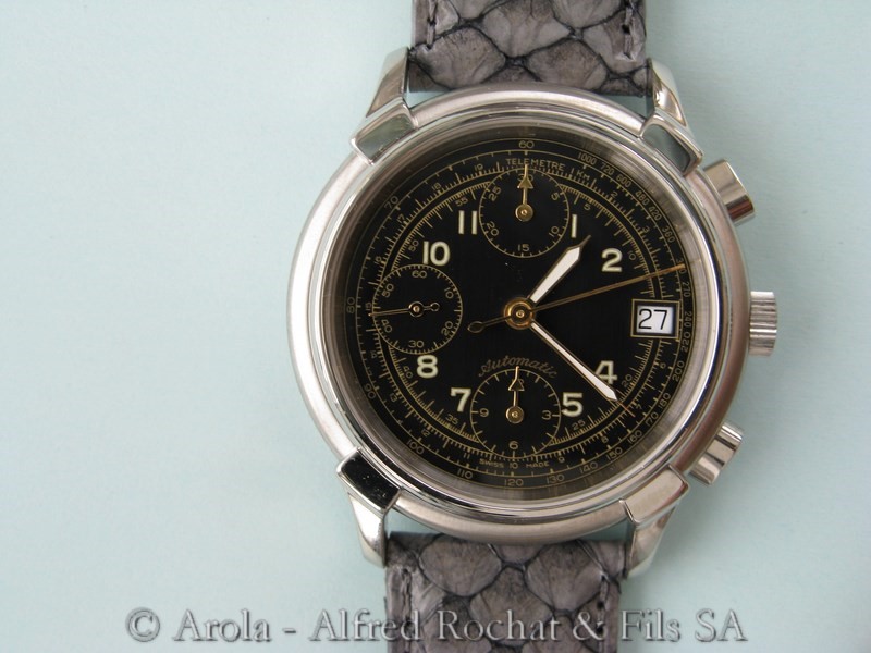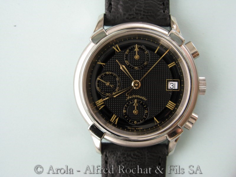Chronographe équipé du mouvement 7750 Valjoux avec date à guichet.