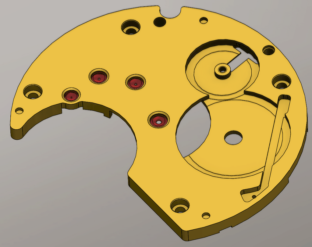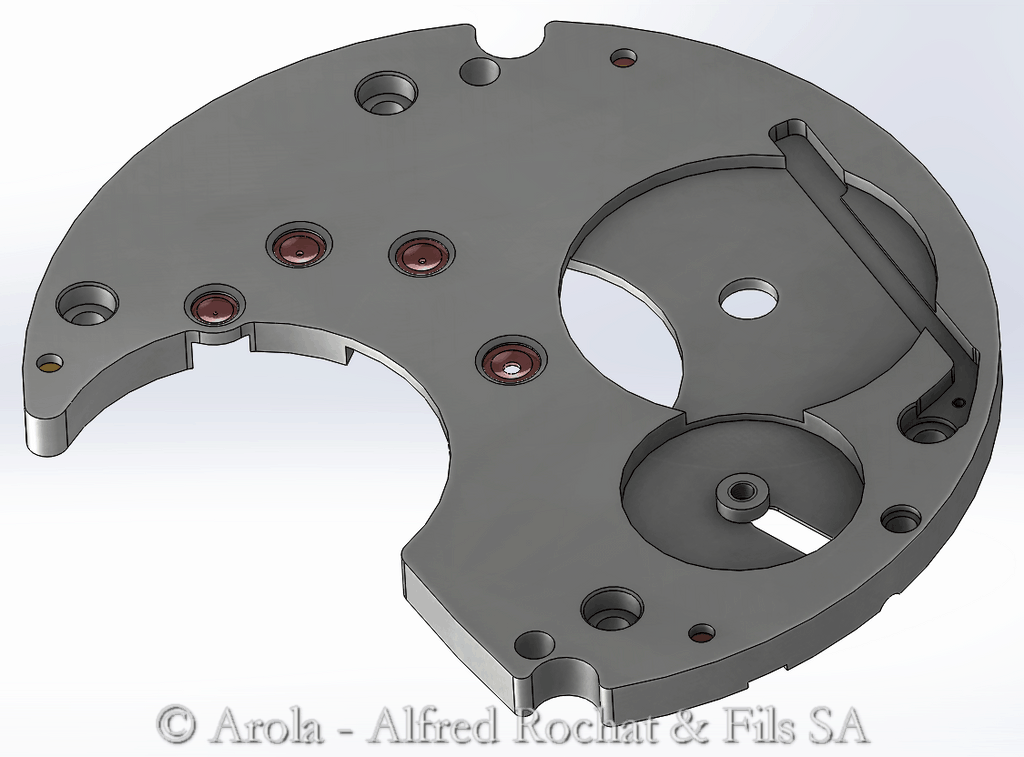 En lieu et place des ponts de barillet et de rouage, nous proposons un pont 3 quarts avec le ressort-cliquet de rochet et sa vis. Il est possible de l'obtenir brut ou décoré et galvanisé.